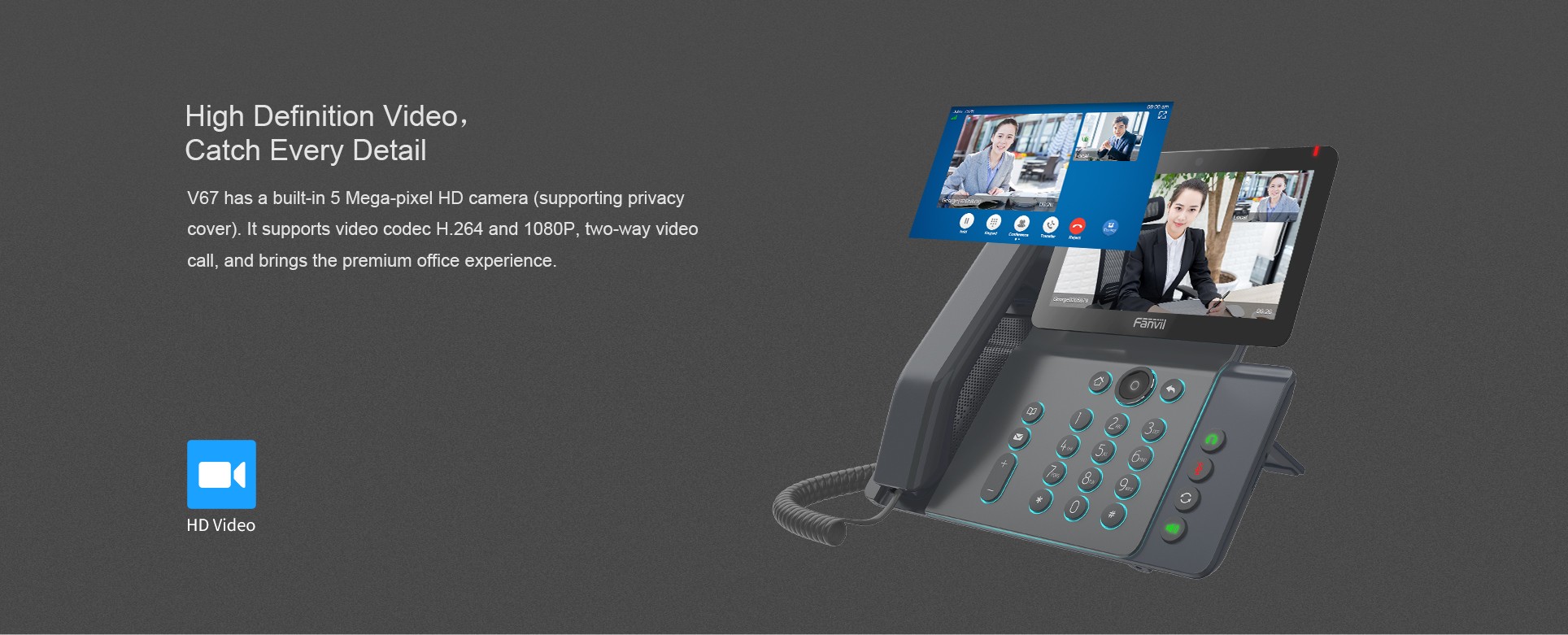 En tant que téléphone IP d'entreprise haut de gamme avec système Android 9.0, le V67 offre aux utilisateurs une expérience tactile plus intelligente et plus fluide. 112 touches programmable sur l'écran tactile couleur de 7 pouces, WiFi et Bluetooth intégré rendent les communications quotidiennes plus intelligentes et plus simples.