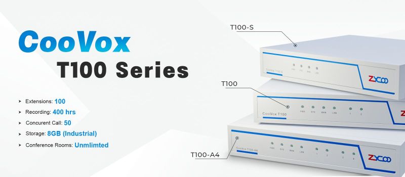 Le Zycoo CooVox-T100 est le système téléphonique IP 50 appels simultané et 100 postes avec 2 FXO et 2 FXS de cinquiéme génération, tout en étant le premier système téléphonique. Il représente une évolution vers le système téléphonique IP PBX intelligent de 5ème génération conçu et optimisé pour répondre aux besoins de télécommunication des entreprises d'aujourd'hui.
