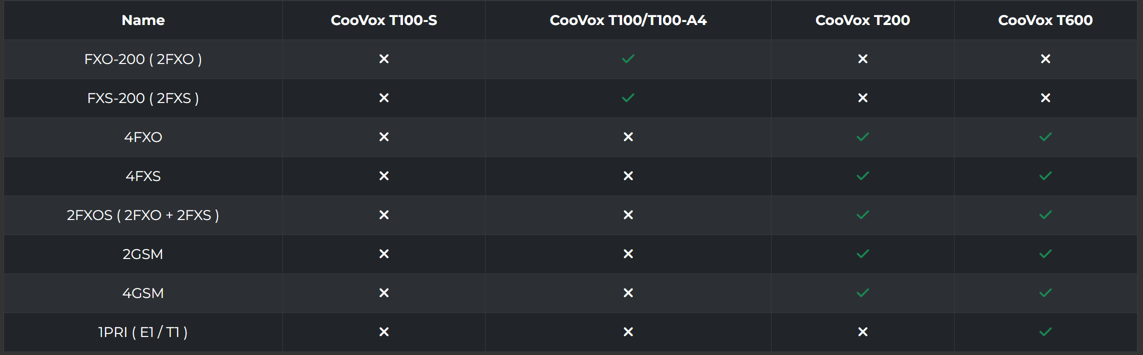 La série T comprend quatre produits. Les CooVox T100 et T-100S et T100-A4 sont des systèmes IPPBX miniatures faciles à configurer et délicats, spécialement conçus pour les petites et moyennes entreprises à travers le monde. Le CooVox T100 est un système IPPBX de taille modérée facile à configurer et délicat, spécialement conçu pour les PME. La série T prend en charge le réseau mixte de téléphones analogiques et de téléphones VoIP. Les lignes externes peuvent être sélectionnées parmi les lignes analogiques ou les lignes VoIP. La série T peut offrir aux utilisateurs plus de commodité dans l'application et la gestion, tout en améliorant l'efficacité de la communication en entreprise et en aidant à renforcer la valeur de l'entreprise.