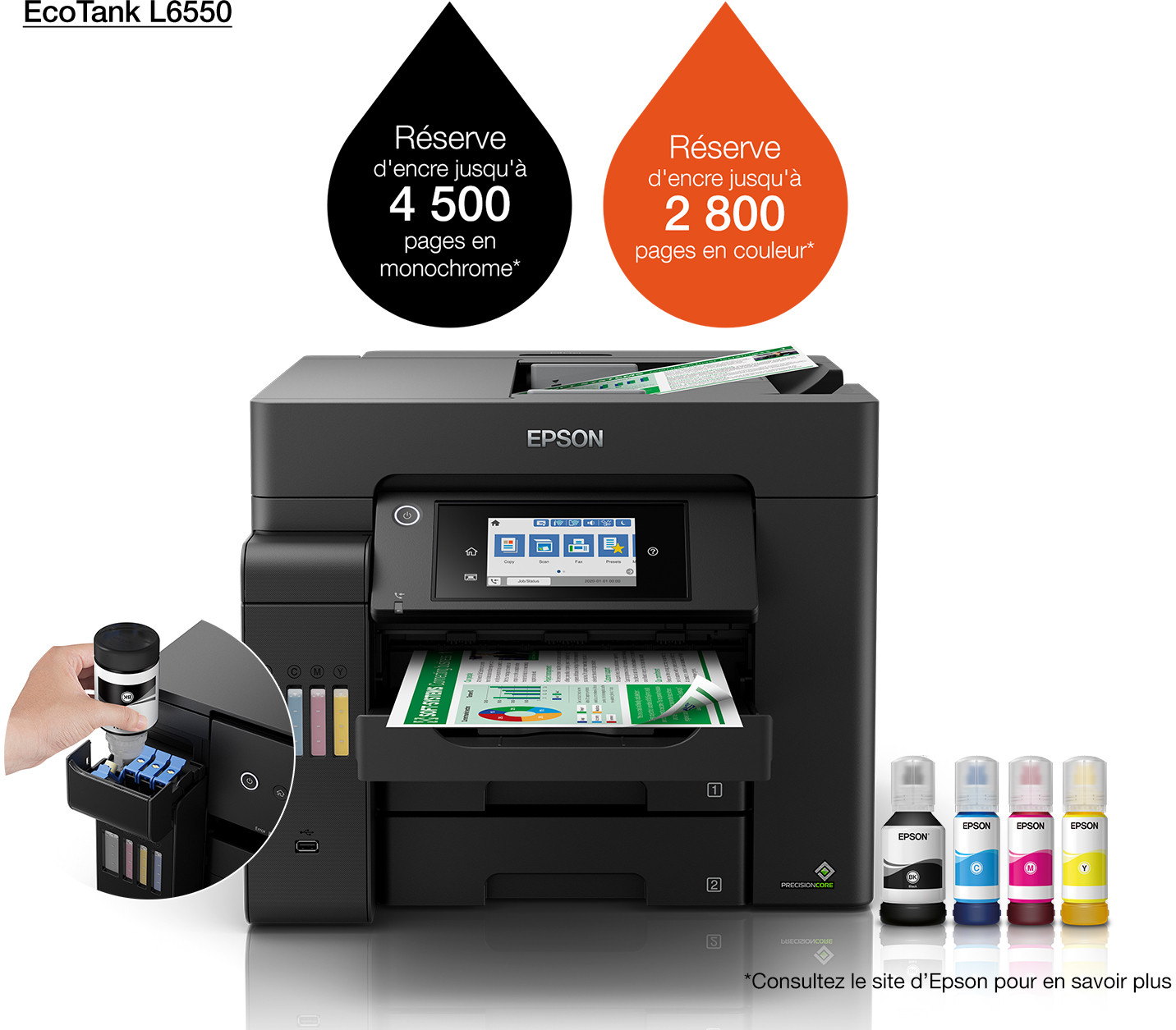Consommables fournis avec l'imprimanteLivrée avec encre noire jusqu'à 4500 pages et 2800 pages en couleur